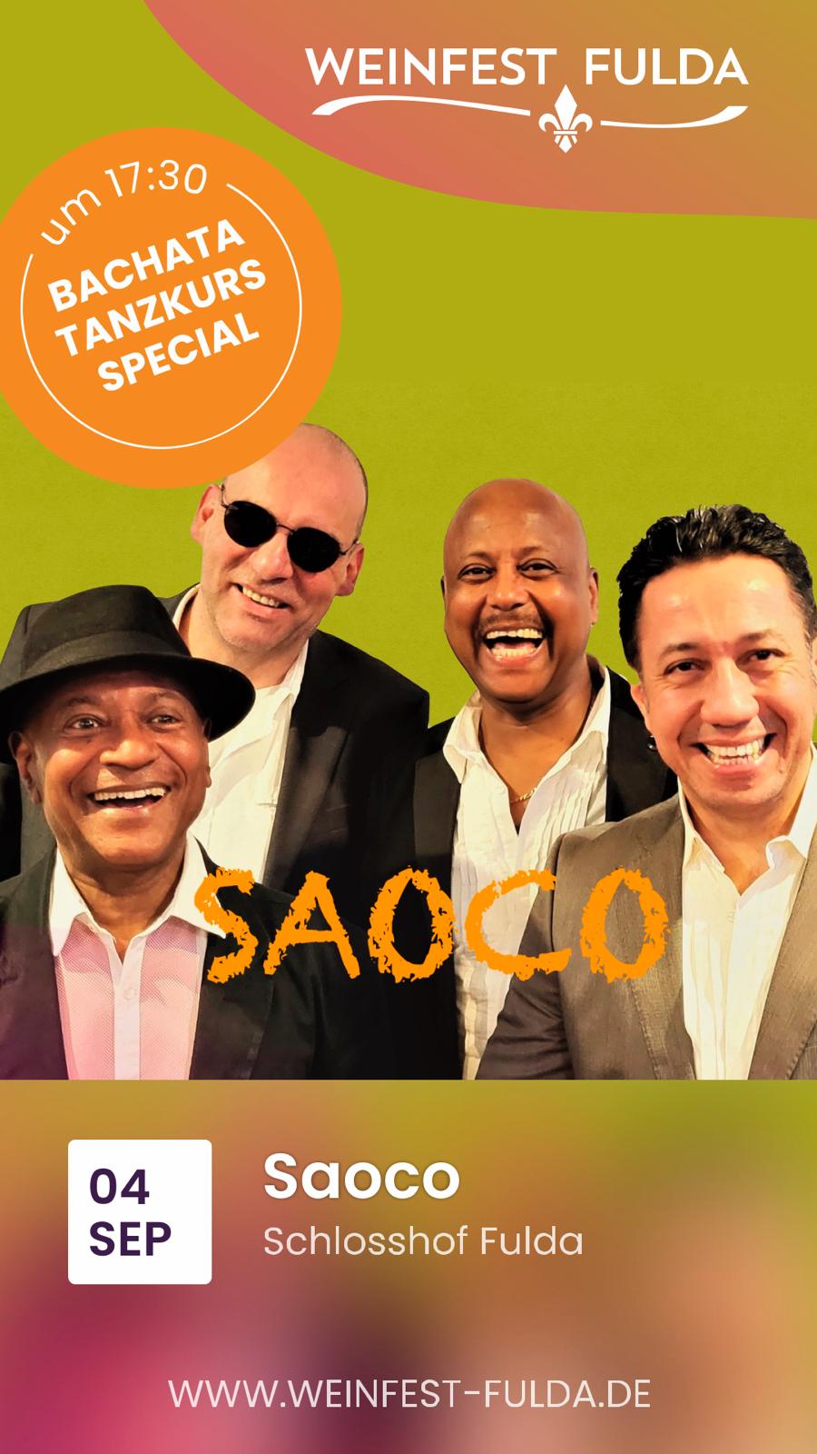 Eine energiegeladen Show erwartet Euch mit authentischen Klängen zu Salsa-, Merenque- und Latin-Pop. Saoco sorgt für echtes Urlaubsfeeling.